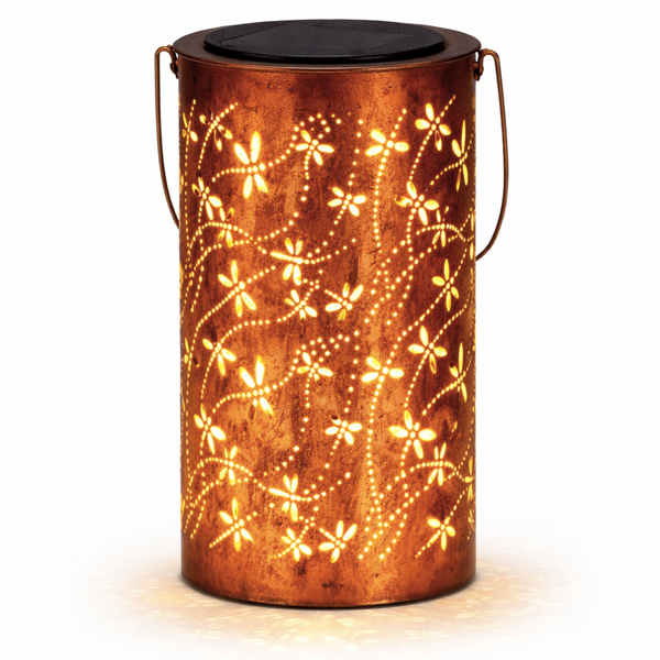 With the LED Dragonfly Sea solar lantern, you can create a light and whimsical atmosphere in your outdoor space. The delicate dragonfly and dot patterns cast a fascinating, warm glow in the dark, while the antique copper finish gives it an elegant, slightly rustic look.